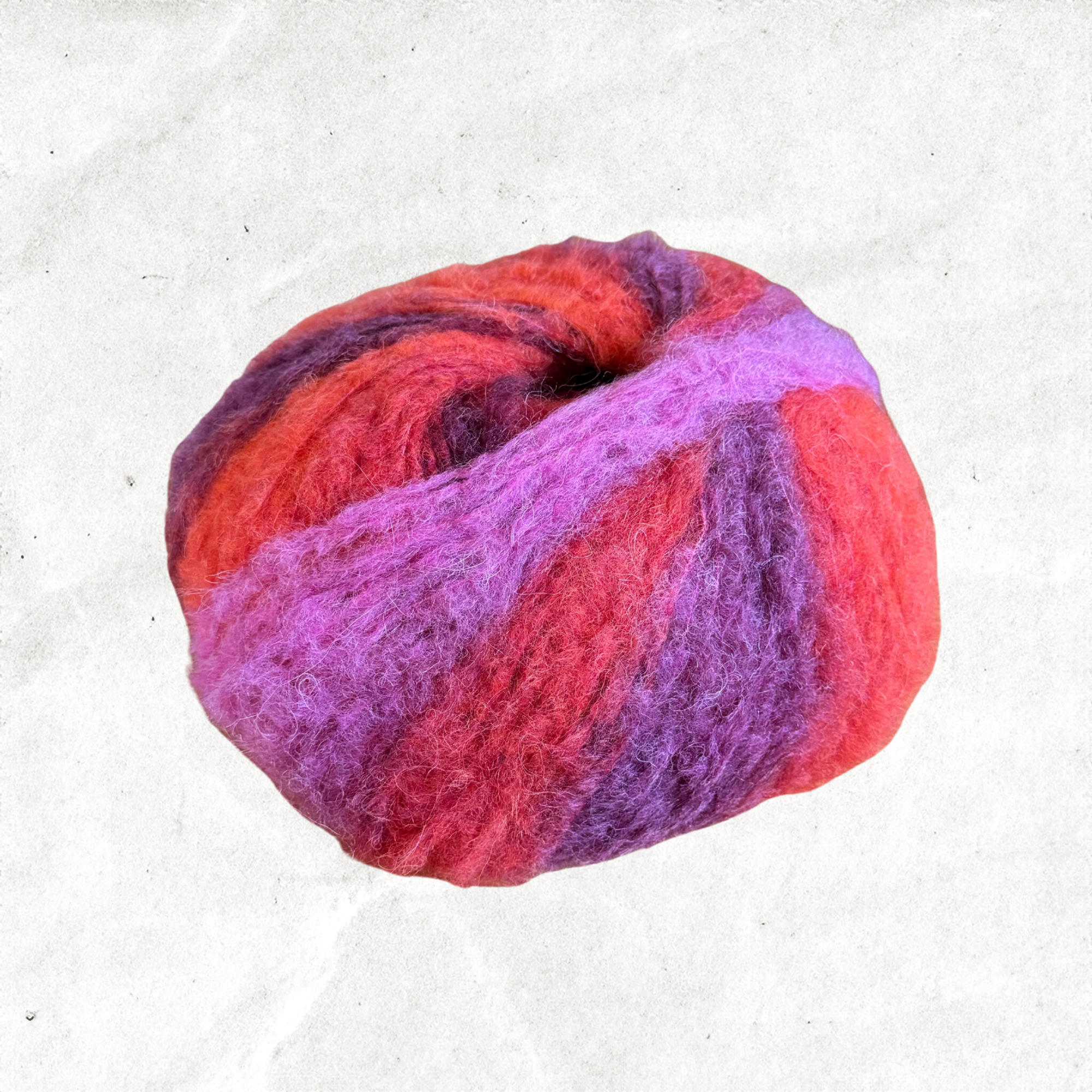 A color changing bulky alpaca blend that forms a unique striped pattern. Due to the uniqueness of this yarn, each skein may vary in color distribution compared to the image shown.