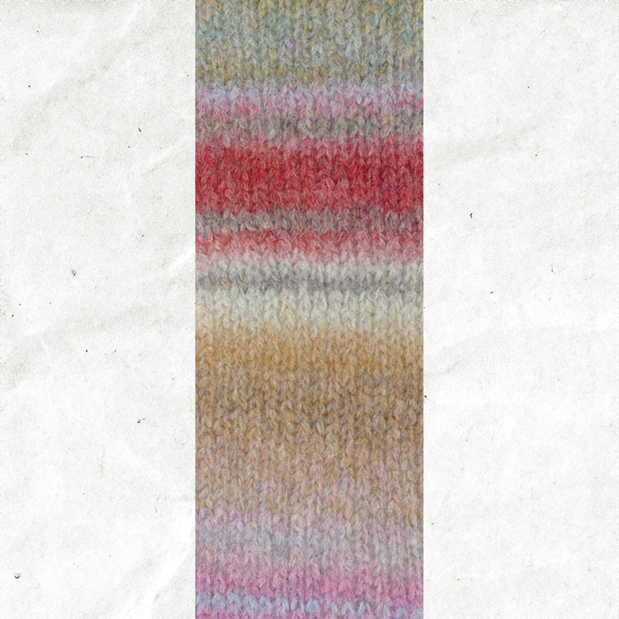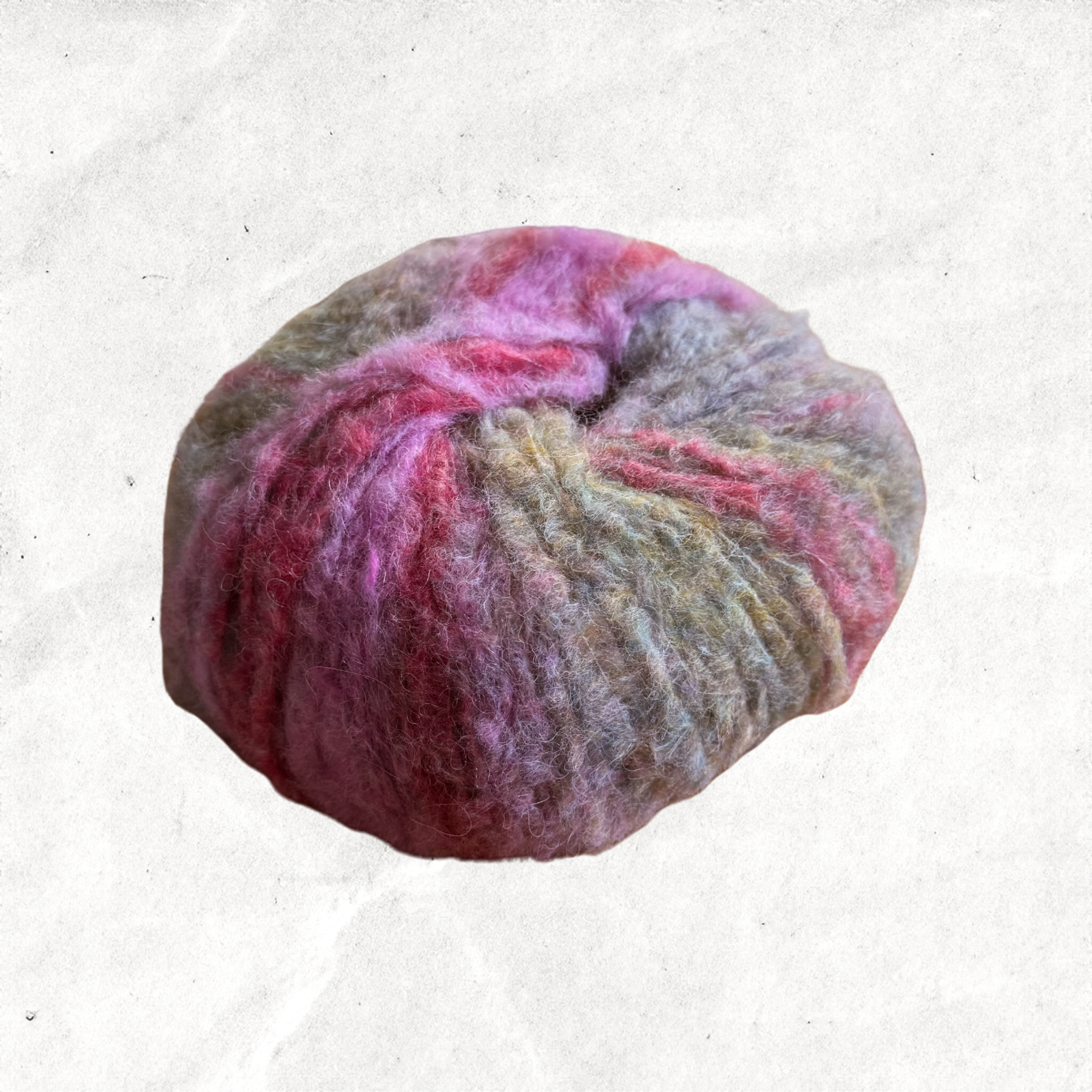A color changing bulky alpaca blend that forms a unique striped pattern. Due to the uniqueness of this yarn, each skein may vary in color distribution compared to the image shown.